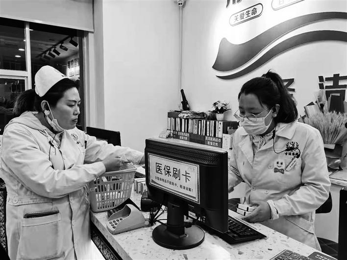 拉薩市某藥店工作人員幫市民刷卡結(jié)賬。
