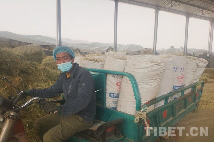 圖為崗尖村村民普布在養(yǎng)殖場(chǎng)運(yùn)送草料