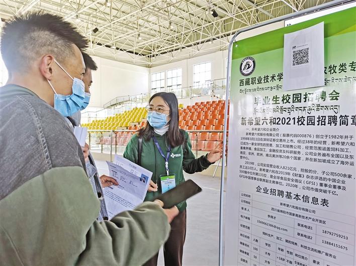 圖為西藏職業(yè)技術(shù)學(xué)院2021屆農(nóng)牧類(lèi)專(zhuān)業(yè)畢業(yè)生校園招聘會(huì)現(xiàn)場(chǎng),新希望六和股份有限公司工作人員向?qū)W生介紹招聘信息。記者 王莉 攝