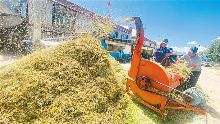 圖為達孜區(qū)農(nóng)牧民群眾利用機械切割飼草。記者 格桑倫珠 攝