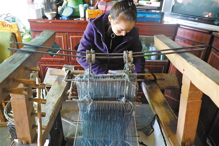 圖為山南市措美縣卓德村村民德吉措姆在務(wù)工返鄉(xiāng)期間編織毛毯。白瑪頓珠 攝