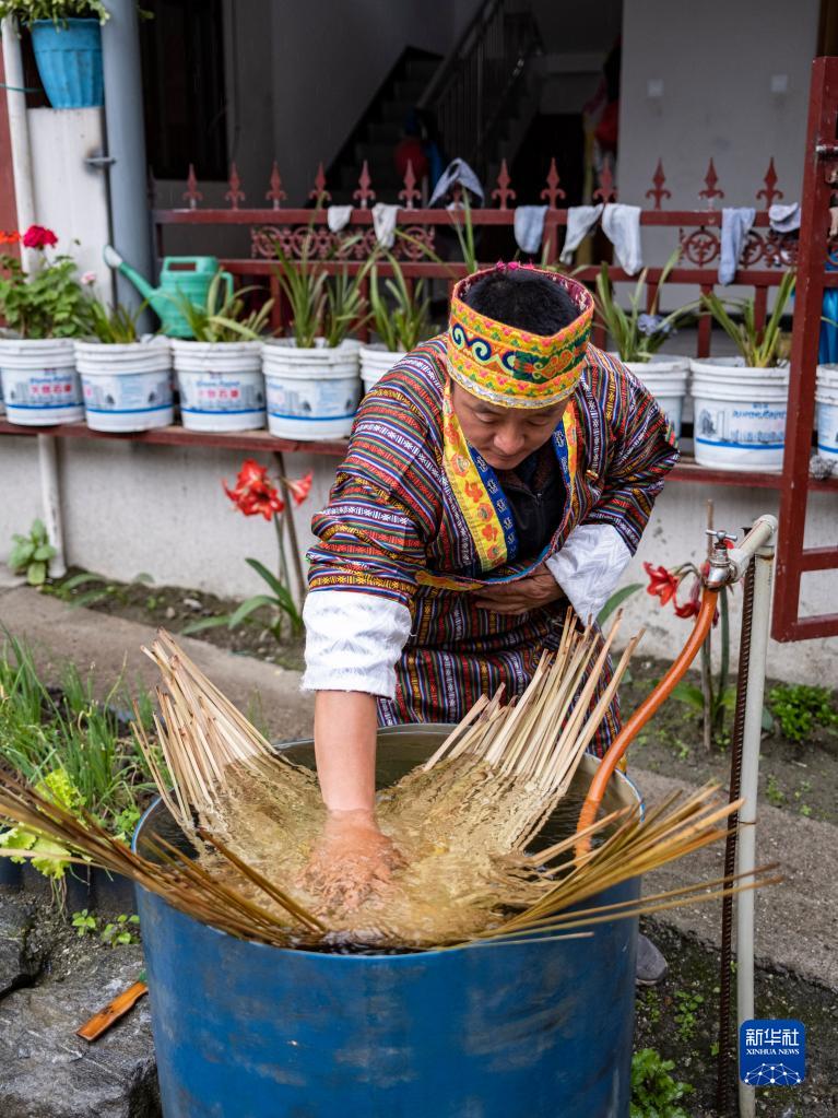 巴登村村民浸泡竹條用于編織竹筐(4月15日攝)。新華社記者 孫非 攝