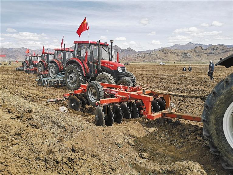 圖為林周縣曲嘎強村村民用農用機械平整土地種植燕麥飼草。楊先亮 攝記者 李成業(yè)