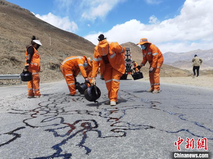圖為在基層農(nóng)村公路,女護(hù)路員正熟練地開展瀝青灌縫作業(yè)?!∥鞑刈灾螀^(qū)交通運(yùn)輸廳供圖