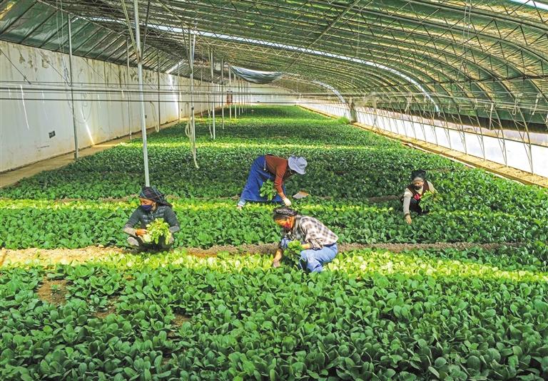 圖為西藏金麥穗農(nóng)業(yè)科技發(fā)展有限公司員工在大棚里為農(nóng)作物疏苗。 記者 丹增群培 攝