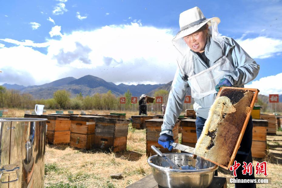 5月28日,在海拔3650米的西藏自治區(qū)山南市貢嘎縣巔峰貢蜜蜂巢一號(hào)綜合體的養(yǎng)蜂基地,工作人員正在取蜜。據(jù)悉,該地的巔峰貢蜜項(xiàng)目是湖南長(zhǎng)沙市第九批援藏工作隊(duì)牽頭孵化、推進(jìn)并建設(shè)壯大的全新項(xiàng)目。項(xiàng)目于2020年5月開始建設(shè),目前已經(jīng)完成蜂巢一號(hào)綜合體、透明工廠、陽光餐廳以及八個(gè)蜜蜂養(yǎng)殖示范基地,帶動(dòng)藏族同胞就業(yè)358人,投產(chǎn)之后第一年銷售額達(dá)到800萬元。圖為工作人員進(jìn)行取蜜。 楊華峰 攝