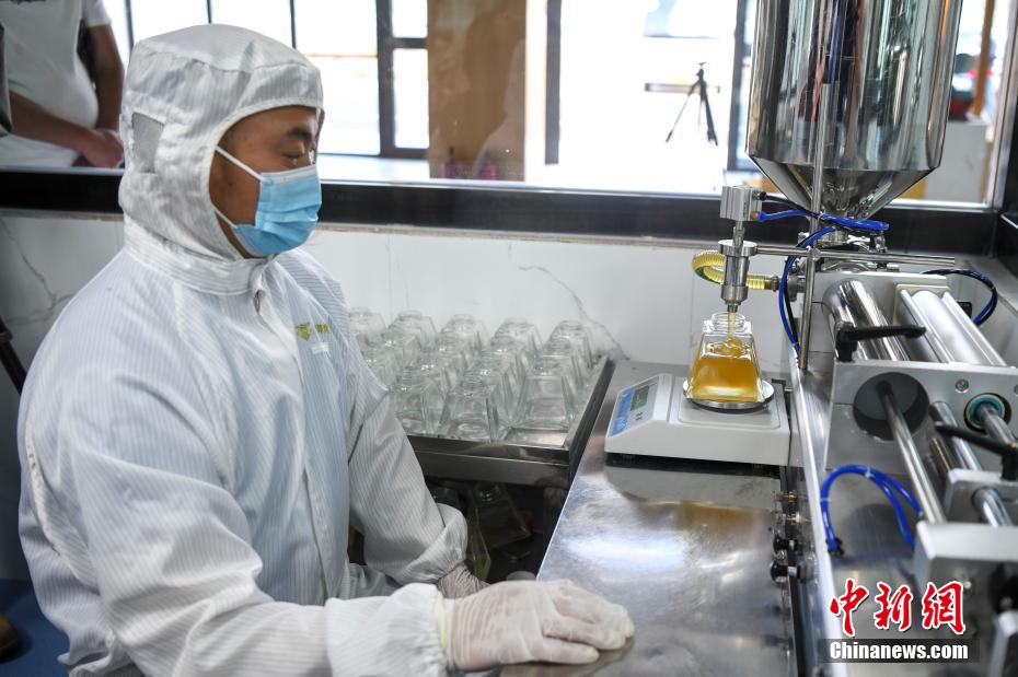 圖為工作人員在透明工廠內(nèi)為蜂蜜封裝。 楊華峰 攝