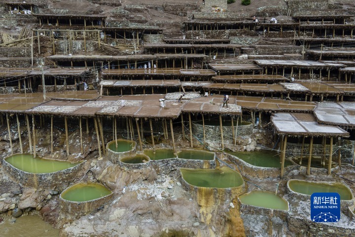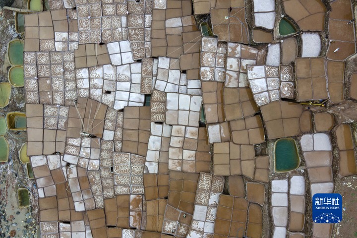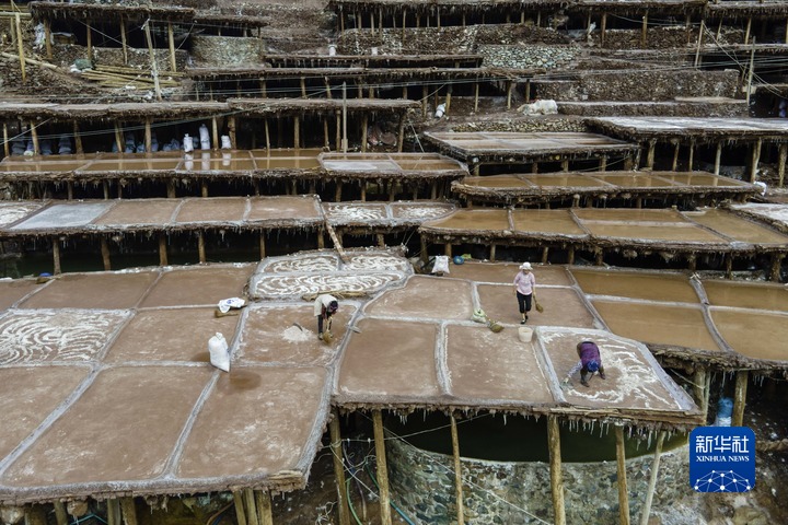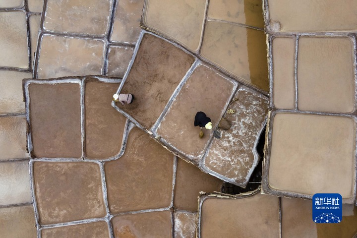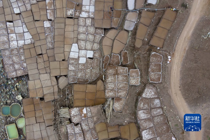 加達(dá)村村民在古鹽田里勞作(無(wú)人機(jī)照片,5月26日攝)。新華社記者 周荻瀟 攝