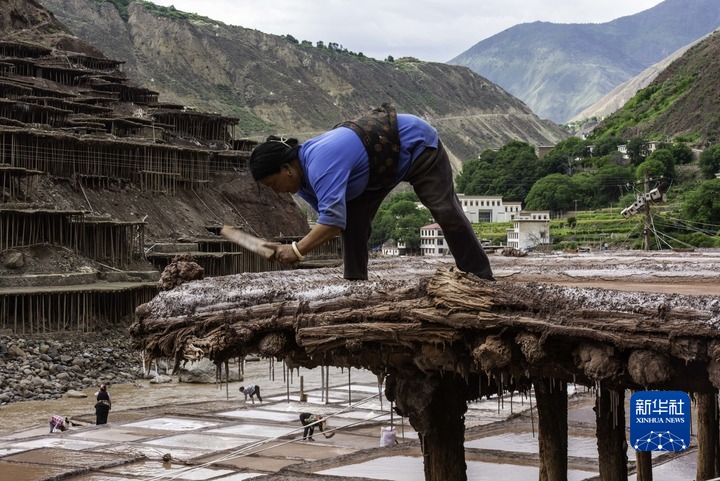 當(dāng)?shù)卮迕袢员3种嫉氖止覃}方式,他們從瀾滄江畔的鹽井、鹽池中取出鹵水倒入鹽田,經(jīng)陽(yáng)光蒸曬、風(fēng)干,結(jié)晶成鹽。這項(xiàng)古老的技藝在加達(dá)村已經(jīng)延續(xù)了1300余年。