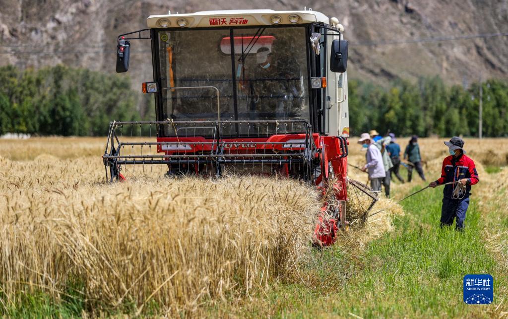 農(nóng)機(jī)合作社和收割工作隊(duì)在林周縣邊林鄉(xiāng)當(dāng)杰村玉沖組搶收小麥(9月6日攝)。新華社記者 姜帆 攝