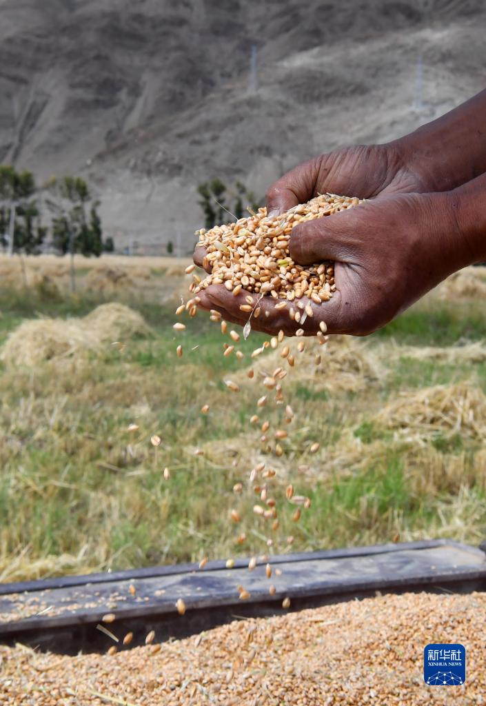 林周縣邊林鄉(xiāng)當(dāng)杰村玉沖組的村民在檢查收獲的小麥(9月6日攝)。新華社記者 覺(jué)果 攝