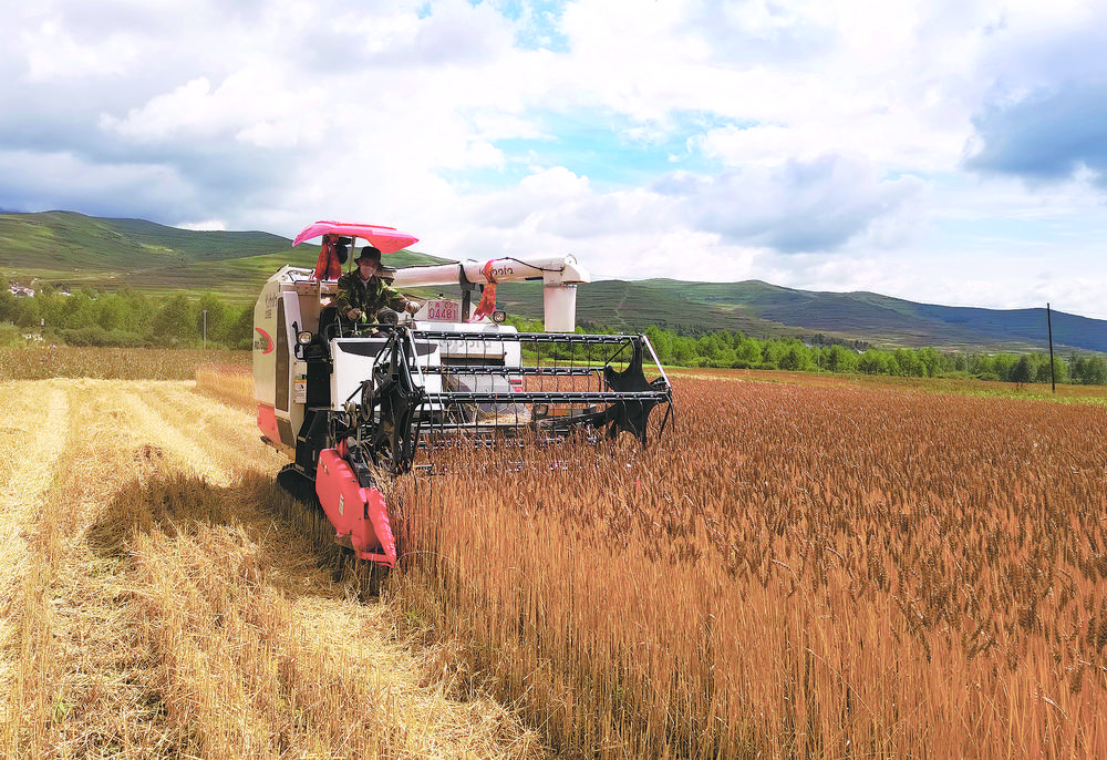 收割機(jī)穿梭在金色麥浪中。