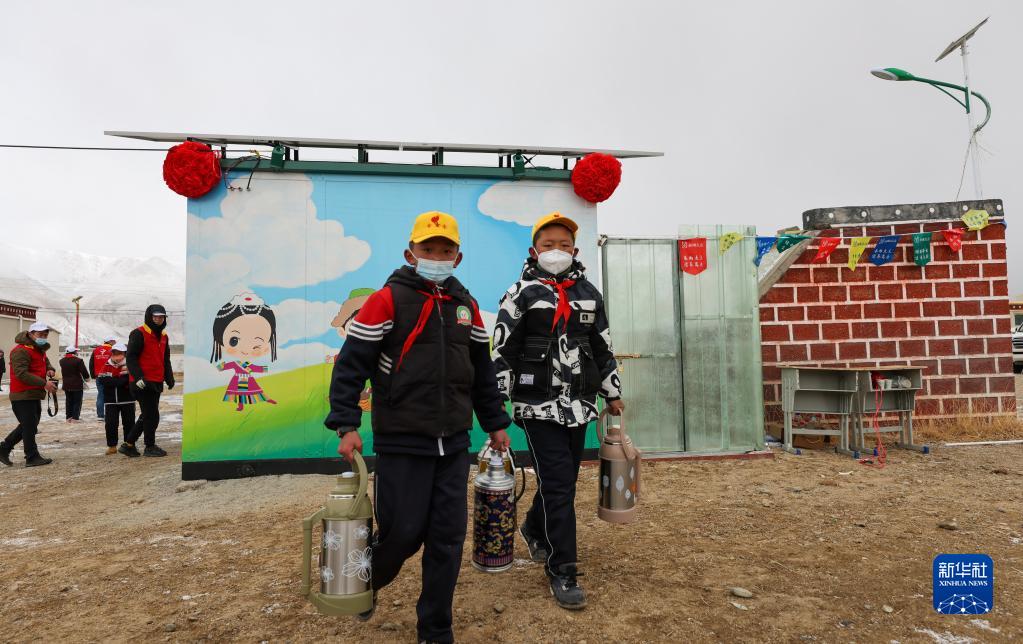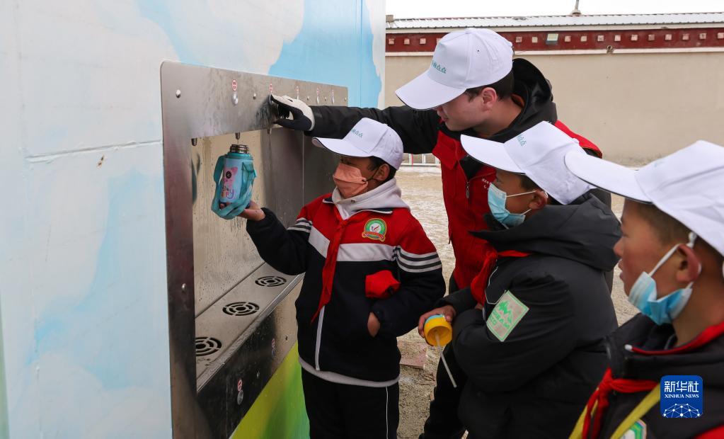 3月21日,那曲市色尼區(qū)香茂鄉(xiāng)小學(xué)的同學(xué)們在新啟用的凈水站打水。新華社記者 姜帆 攝