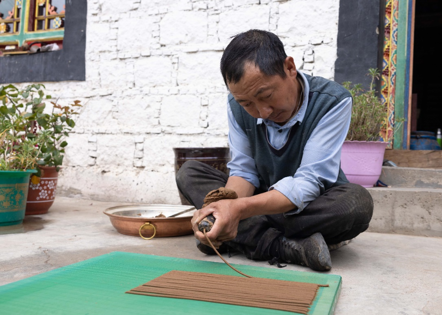 走進藏香專業(yè)制作戶格桑次仁家中,他正把混著各種香料的柏木泥放入由牛角特制的工具中,擠出一根根長條。