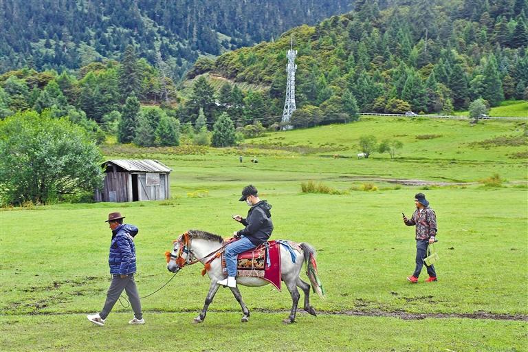 在平措大叔家庭旅館內(nèi)住宿的游客體驗(yàn)騎馬。 記者 張猛 攝
