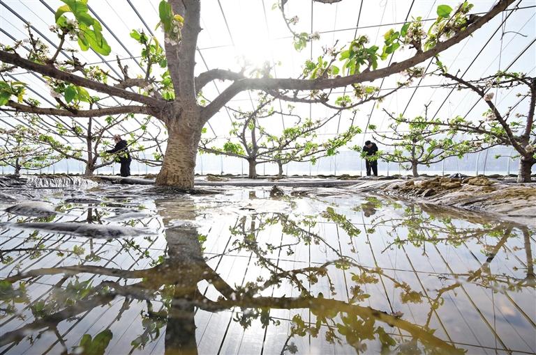 河北省灤州市茨榆坨鎮(zhèn)的果農(nóng)在大棚內(nèi)給櫻桃樹疏花。