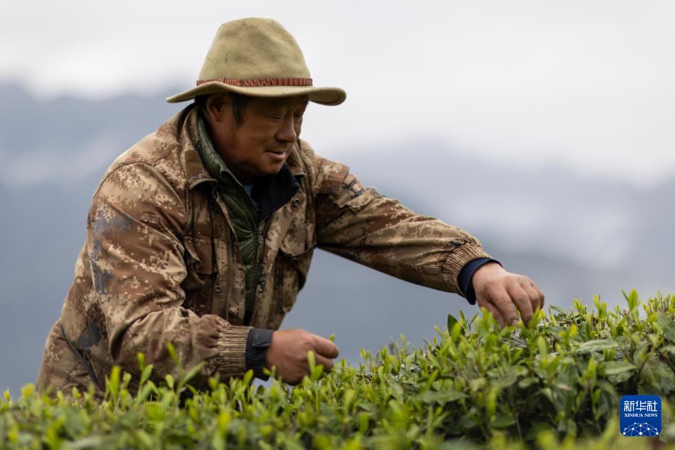 墨脫縣背崩鄉(xiāng)格林村村民登巴扎巴在茶園中采茶(4月24日攝)。新華社記者 姜帆 攝