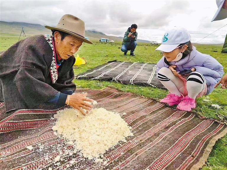 圖為游客在瑪如村觀看當(dāng)?shù)啬撩裰谱髂淘?。記?丹增平措 攝