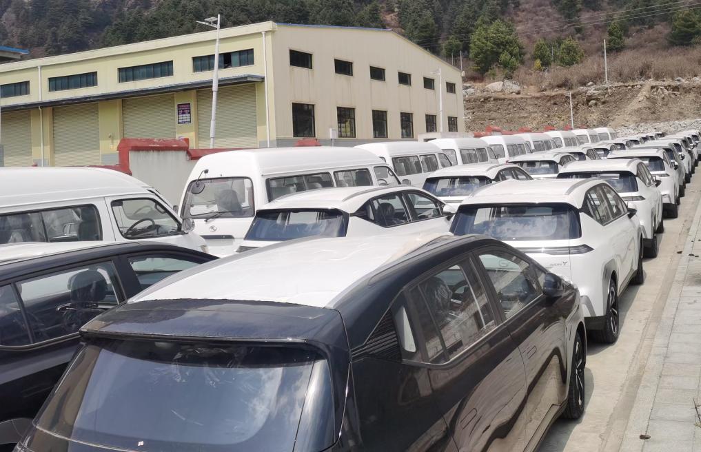 在日喀則市吉隆邊境經(jīng)濟(jì)合作區(qū),一批新能源汽車等待出口。新華社記者魏冠宇 攝