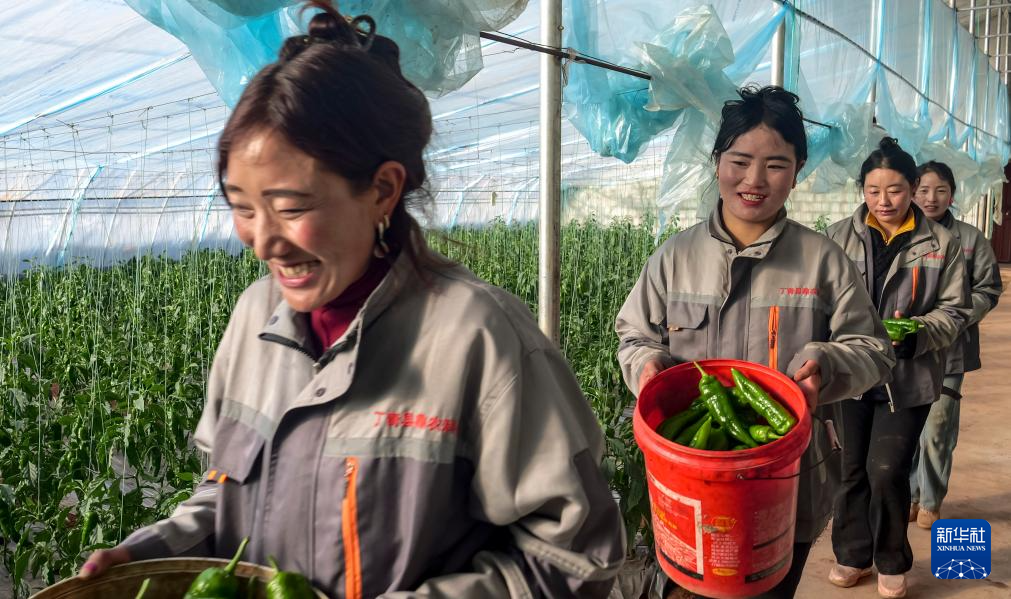 11月22日,在丁青縣農(nóng)業(yè)生態(tài)產(chǎn)業(yè)園,工作人員搬運(yùn)采摘的辣椒。新華社記者 普布次仁 攝