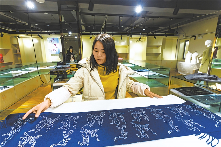 圖為日土縣白山羊絨產(chǎn)業(yè)展示中心的工作人員展示印有日土巖畫圖案的“指環(huán)披肩”。新華社記者 姜帆 攝