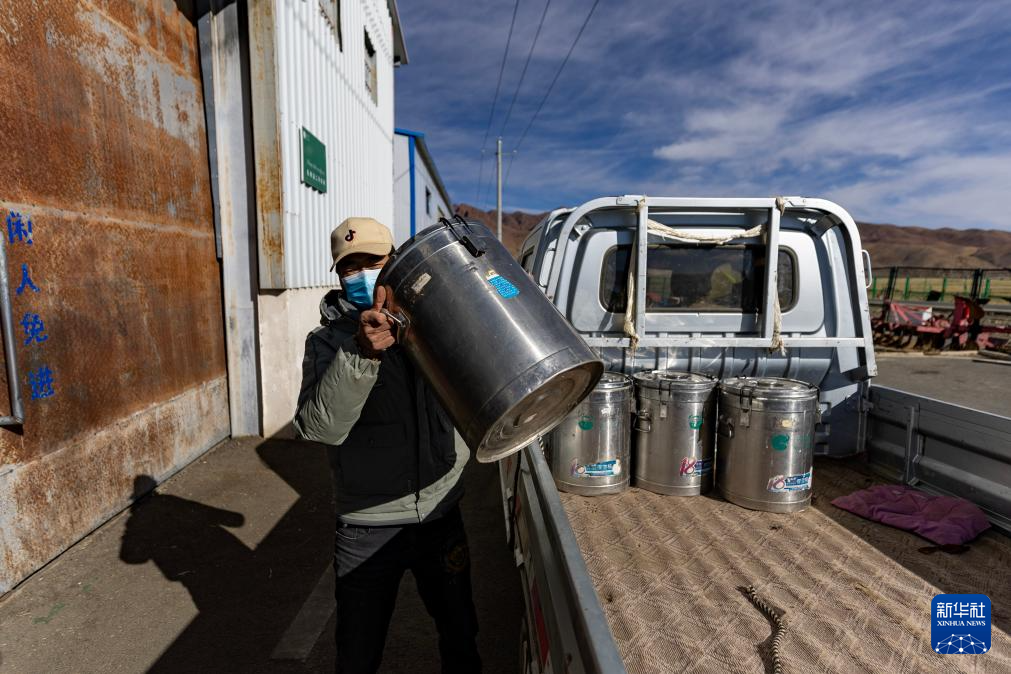 11月28日,牧民次仁頓珠在收奶站搬運(yùn)奶桶。新華社記者 姜帆 攝