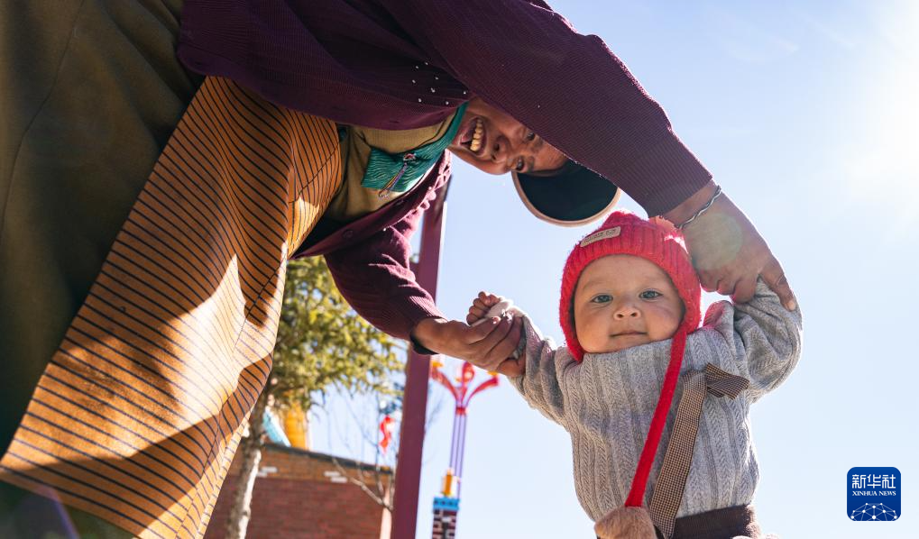 12月15日,達曼新村的一名婦女在教孩子走路。新華社記者 丁增尼達 攝
