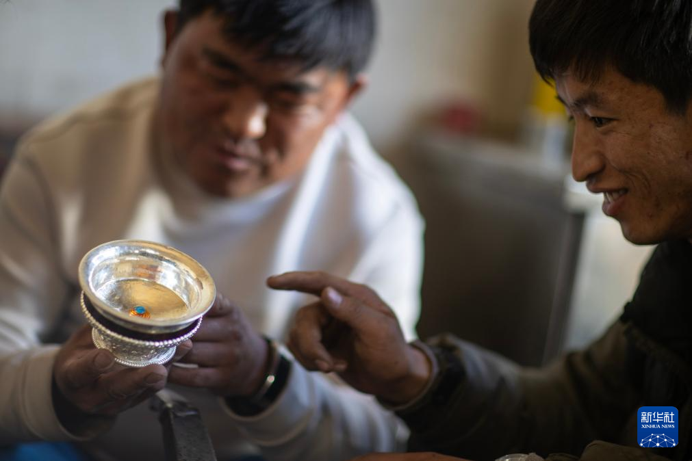 3月6日,扎西吉彩的手工匠人在討論銀器的造型。新華社記者 姜帆 攝