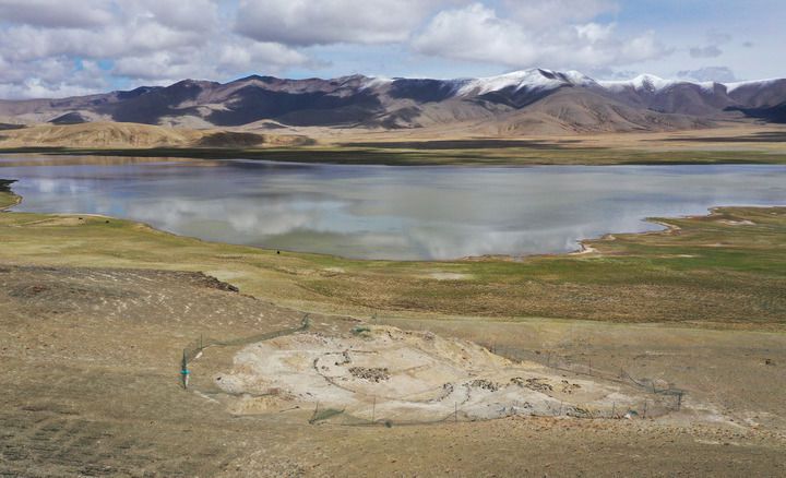 這是2025年5月22日拍攝的坐落在瑪不錯(cuò)湖畔的遺址第四期石構(gòu)地面建筑考古發(fā)掘現(xiàn)場(chǎng)(無(wú)人機(jī)照片)。新華社記者 李賀 攝