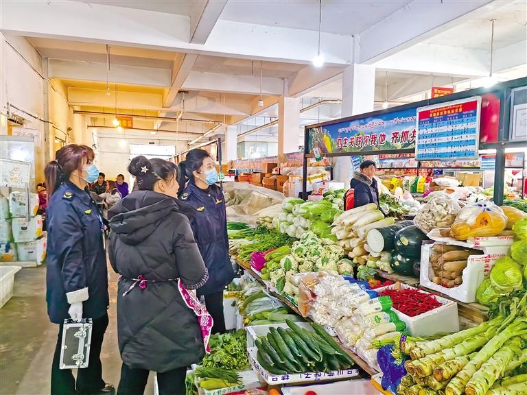 圖為工作人員在農(nóng)貿(mào)市場重點檢查“兩個責任”工作機制和索證索票、進貨查驗等制度落實。