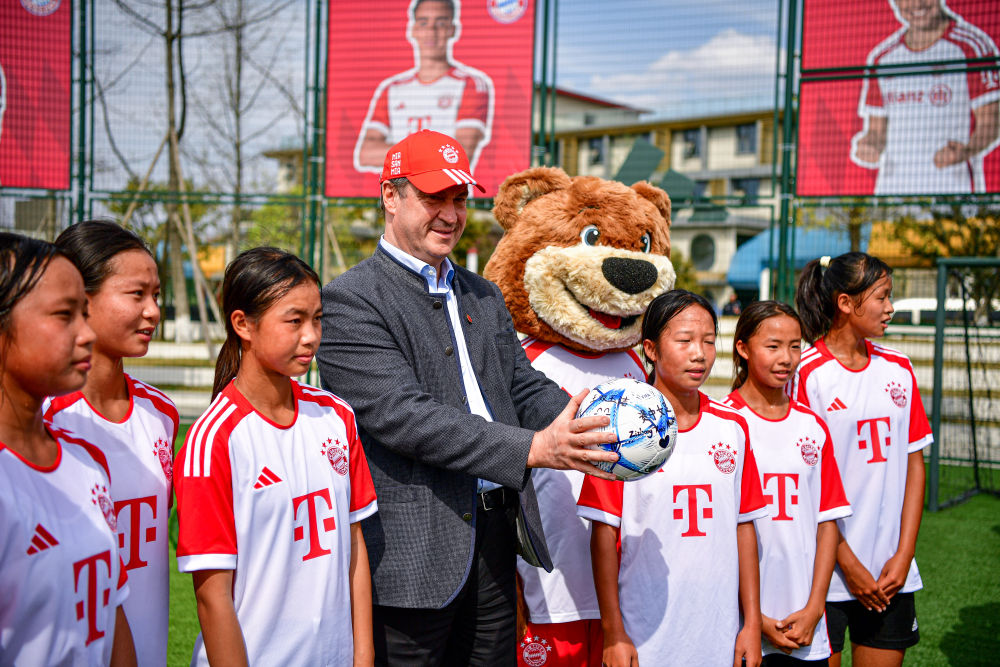 德國巴伐利亞州州長索德爾(左四)在位于成都市武侯區(qū)的阿迪達斯20號體育公園觀摩了一場中國少年女子足球隊的訓練賽。新華社記者張超群攝