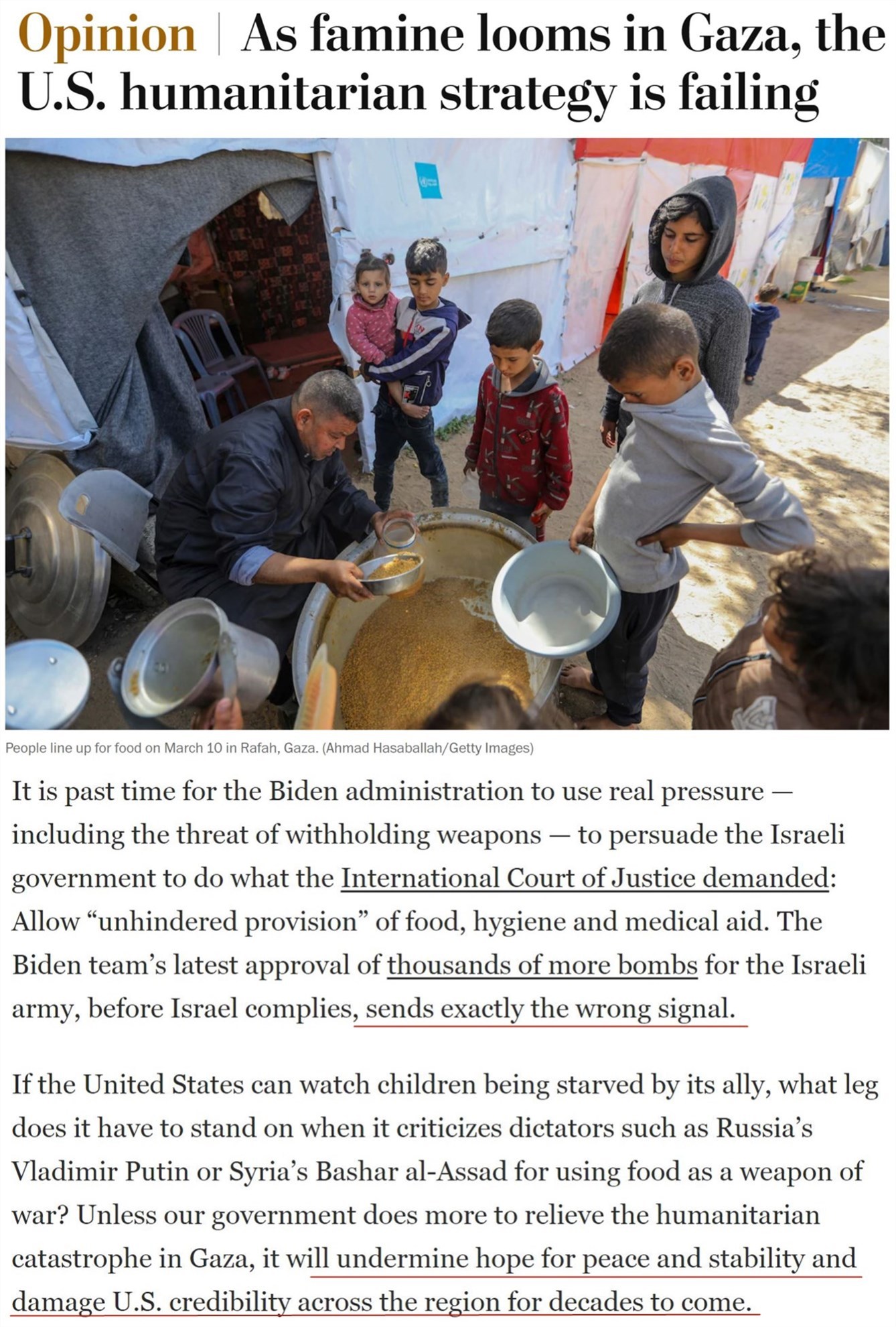文章認(rèn)為,拜登政府早就應(yīng)該利用真正的壓力——包括威脅中斷武器供應(yīng)——來(lái)迫使以色列政府允許外界向加沙“不受阻礙地提供”食品和醫(yī)療援助。但相反,拜登團(tuán)隊(duì)最近卻批準(zhǔn)再向以軍提供數(shù)千枚炸彈,“這發(fā)出了完全錯(cuò)誤的信號(hào)”。