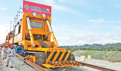 在馬來西亞彭亨州關(guān)丹市馬東鐵項目現(xiàn)場,鋪軌機(jī)正在作業(yè)。