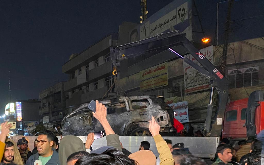 2024年2月7日,在伊拉克首都巴格達(dá),民防部門轉(zhuǎn)移遭無人機襲擊的車輛。新華社發(fā)(哈利勒·達(dá)伍德攝)