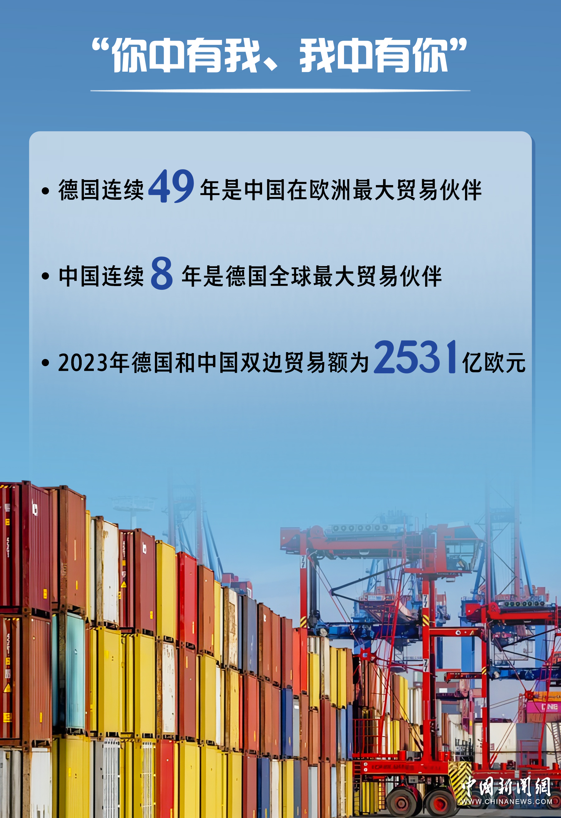 根據(jù)德國聯(lián)邦統(tǒng)計局數(shù)據(jù),2023年德國和中國雙邊貿(mào)易額為2531億歐元,中國已連續(xù)8年成為德國全球最大貿(mào)易伙伴。德國連續(xù)49年是中國在歐洲最大貿(mào)易伙伴。