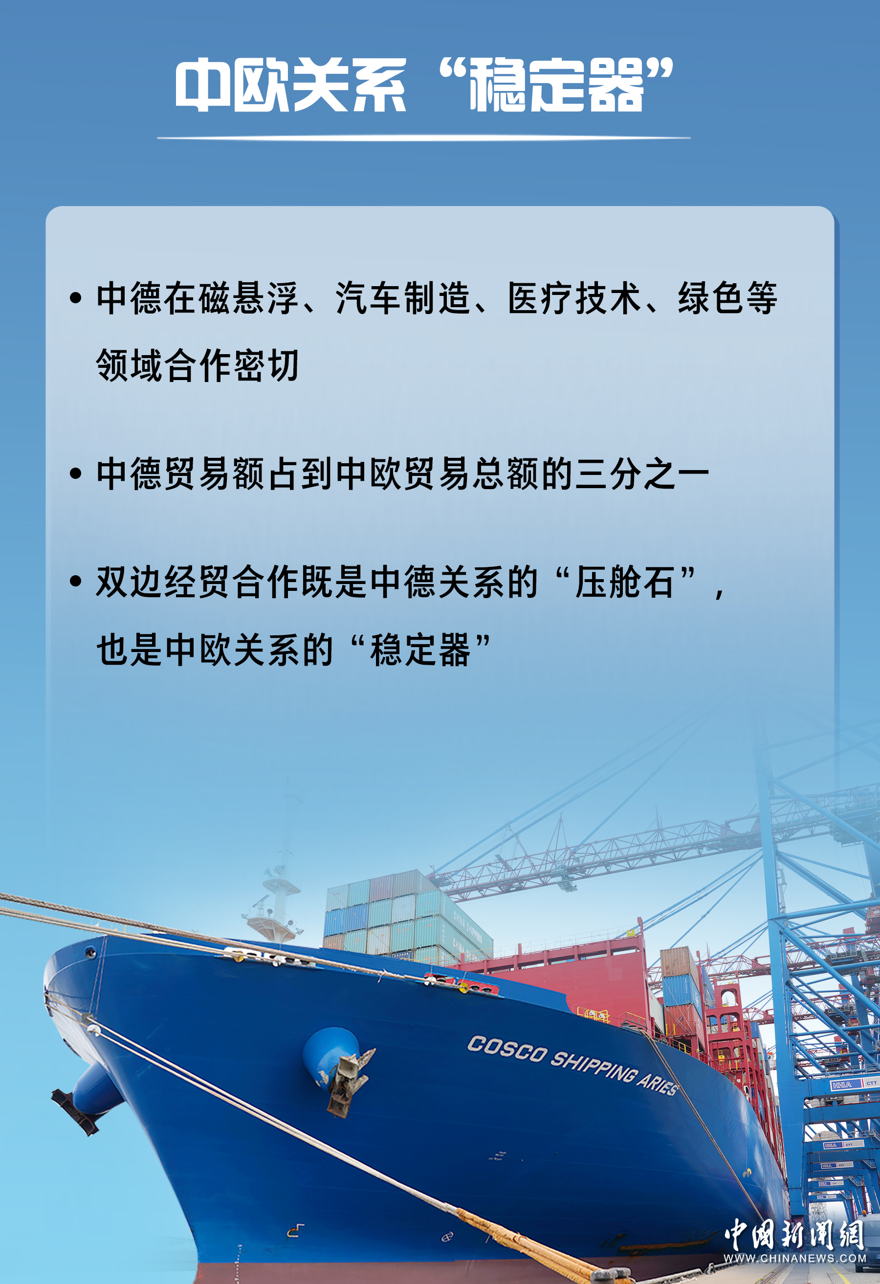 當前,中德貿(mào)易額占到中歐貿(mào)易總額的三分之一,德國對華投資占到歐盟對華投資的三分之一,雙邊經(jīng)貿(mào)合作既是中德關系的“壓艙石”,也是中歐關系的“穩(wěn)定器”。