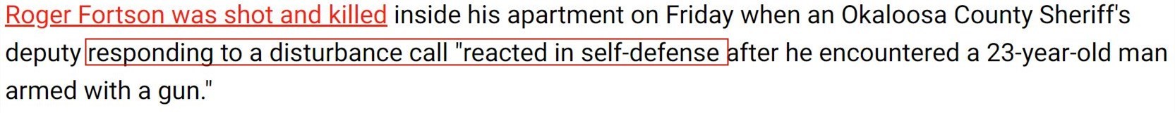 佛羅里達州奧卡魯沙縣警察局在事后發(fā)表的聲明中稱,涉事警察在案發(fā)當天接到有關(guān)“擾亂公共秩序”的報警,后來在看到福特森持槍時出于“自衛(wèi)”才開火。