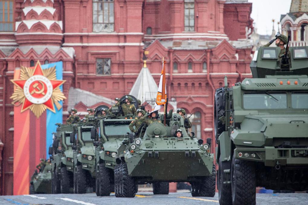 5月9日,在俄羅斯首都莫斯科,軍車編隊(duì)駛過紅場(chǎng)。新華社記者曹陽攝