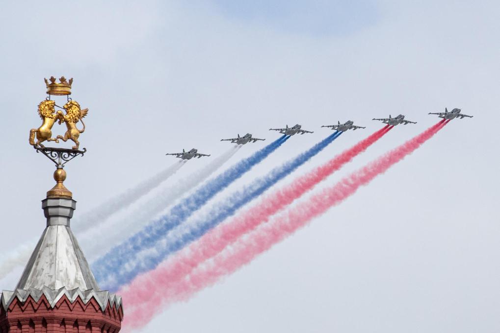 5月9日,在俄羅斯首都莫斯科,蘇-25攻擊機(jī)編隊(duì)在紅場(chǎng)上空飛過。新華社記者白雪騏攝