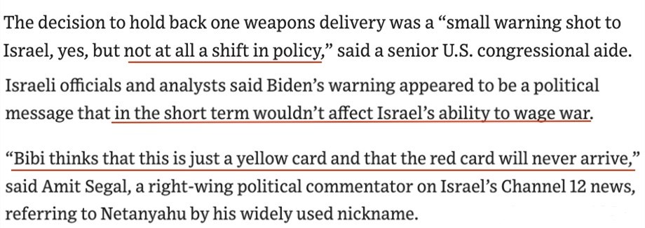 “比比(內(nèi)塔尼亞胡的昵稱)相信拜登只是對(duì)他亮出了一張黃牌,而紅牌永遠(yuǎn)不會(huì)到來?!?/p>