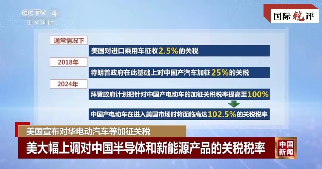 這其中,對中國電動汽車加征的進(jìn)口關(guān)稅令人瞠目——從27.5%升至102.5%,對太陽能電池的進(jìn)口稅從25%提高到50%,對鋰電池的關(guān)稅稅率從7.5%提高到25%。不難看出,美國政府此次針對的重點(diǎn)是中國新能源相關(guān)產(chǎn)業(yè)。難怪美國多名高官近期密集炒作所謂中國新能源“產(chǎn)能過?!保贿^是為加征關(guān)稅制造借口。