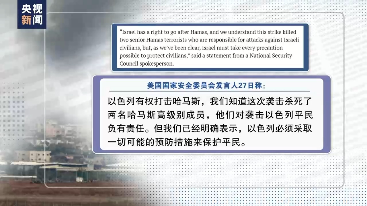 美國國家安全委員會發(fā)言人27日稱:以色列有權打擊哈馬斯,我們知道這次襲擊殺死了兩名哈馬斯高級別成員,他們對襲擊以色列平民負有責任。但我們已經(jīng)明確表示,以色列必須采取一切可能的預防措施來保護平民。