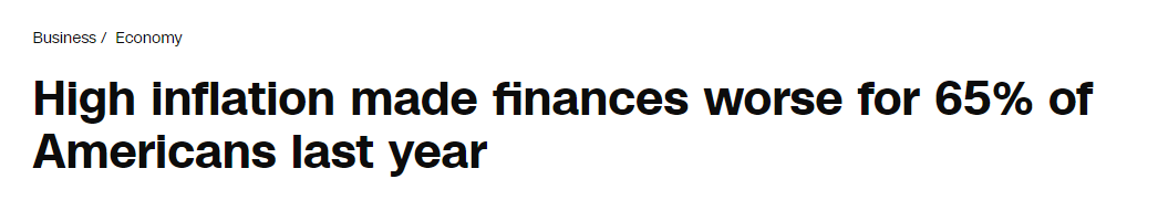 美聯(lián)儲近日發(fā)布的《2023年美國家庭經(jīng)濟狀況報告》(Economic Well-Being of US Households)顯示,65%的美國家庭的財務(wù)狀況因通脹而惡化,其中19%的人認(rèn)為財務(wù)狀況“嚴(yán)重惡化”。