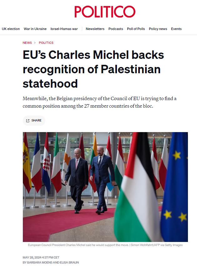 據(jù)《政客網(wǎng)》歐洲版28日?qǐng)?bào)道,盡管歐洲各國(guó)政府在何時(shí)或是否承認(rèn)巴勒斯坦國(guó)問(wèn)題上仍然存在分歧,但歐洲理事會(huì)主席查爾斯·米歇爾表示他將支持這一舉措。