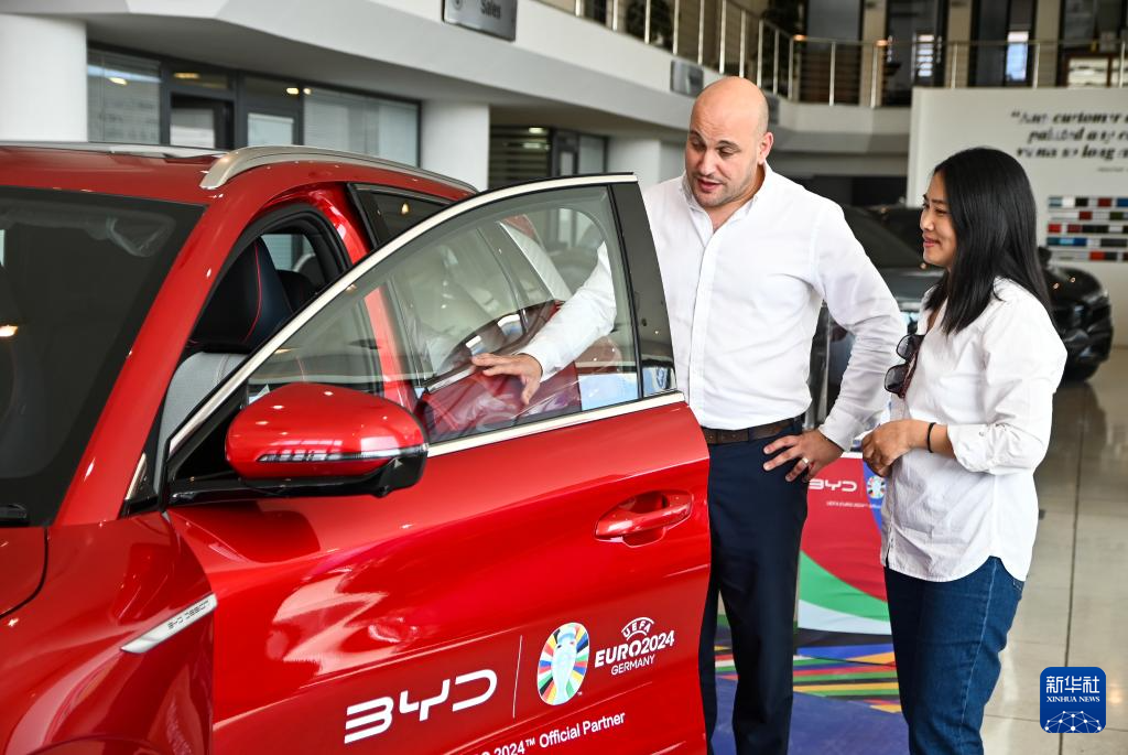 2024年5月29日,在馬耳他比爾基卡拉,馬耳他哈桑-扎米特汽車(chē)公司首席執(zhí)行官德古阿拉(左)介紹一輛比亞迪純電動(dòng)汽車(chē)。新華社發(fā)(喬納森·博格 攝)