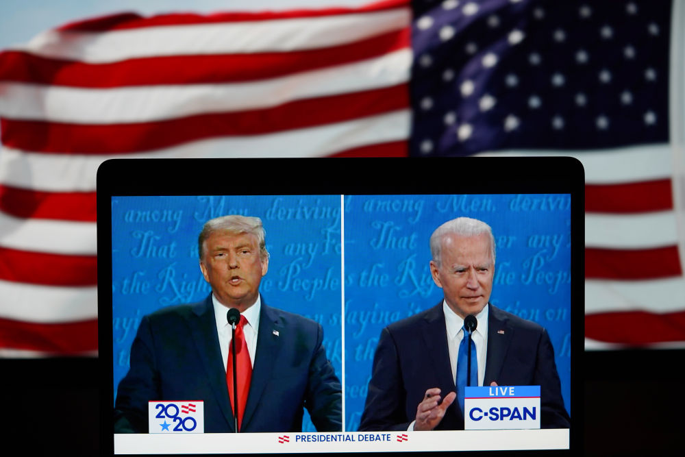 這張2020年10月22日在美國弗吉尼亞州阿靈頓拍攝的視頻畫面顯示,時(shí)任美國總統(tǒng)特朗普(左)與民主黨總統(tǒng)候選人拜登在田納西州納什維爾市參加最后一場總統(tǒng)候選人電視辯論。新華社記者劉杰攝