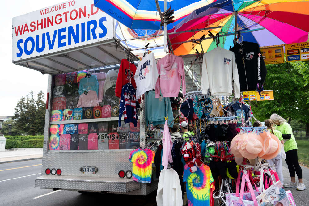 4月25日,在美國首都華盛頓,游客在一處白宮附近的紀念品攤位前選購商品。新華社記者劉杰攝