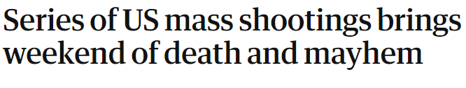 僅周日凌晨,紐約州、亞拉巴馬州、密蘇里州和俄亥俄州就發(fā)生了四起槍擊案,造成至少1人死亡,34人受傷,其中一起槍擊事件現(xiàn)場(chǎng)發(fā)射的子彈數(shù)量至少有362發(fā)。此外,周五在阿肯色州一家雜貨店發(fā)生的槍擊案造成 了4死9傷;周六在肯塔基州某夜總會(huì)發(fā)生的槍擊案造成1死7傷。