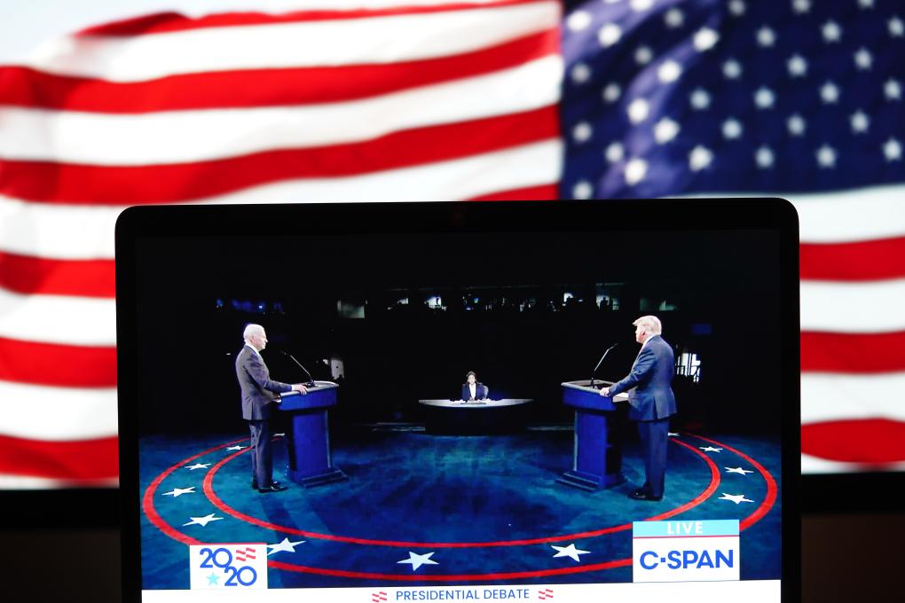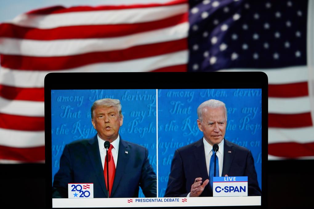 這張2020年10月22日在美國弗吉尼亞州阿靈頓拍攝的視頻畫面顯示,時任美國總統(tǒng)特朗普(左)與時任民主黨總統(tǒng)候選人拜登在田納西州納什維爾市參加最后一場總統(tǒng)候選人電視辯論。新華社記者劉杰攝