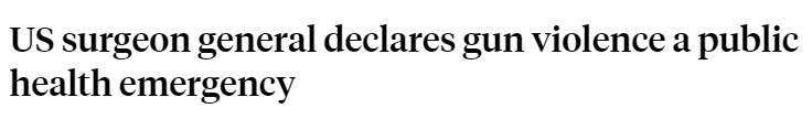 據(jù)美國廣播公司(ABC)25日報(bào)道,美國衛(wèi)生局局長維維克·穆西當(dāng)天宣布,槍支暴力成為一場公共衛(wèi)生危機(jī),原因是涉及槍支的傷亡人數(shù)快速增長。